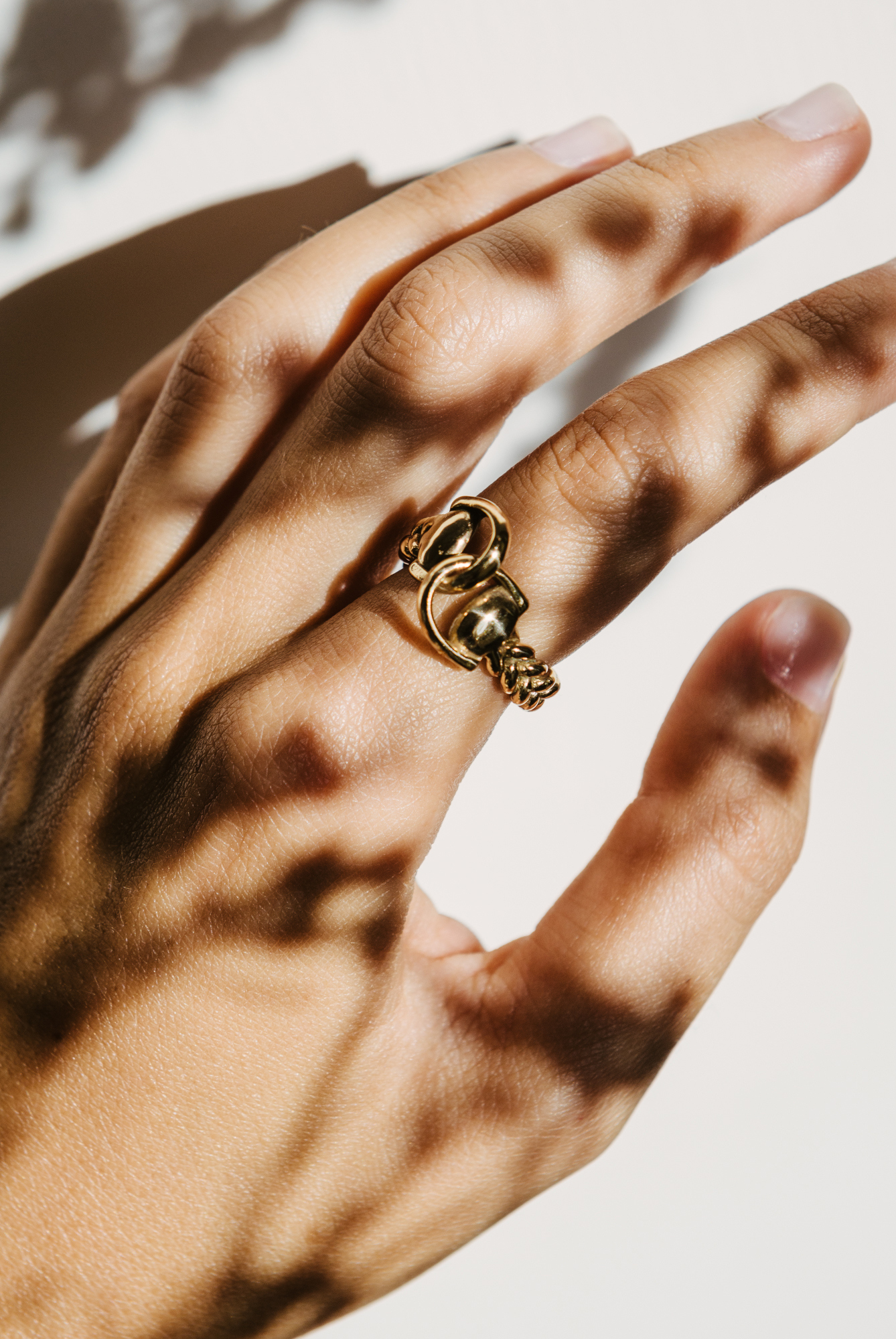 I gioielli sono realizzati interamente a mano: ciò li rende unici. Oltre alla tecnica della cera persa, che è quella che prediligo, utilizzo il bronzo, lo bagno nell’oro 18k, e poi nuovamente in un bagno di trasparenza. Amo particolarmente coniugare l’alta gioielleria con il quotidiano, ad esempio utilizzando tecniche ricercate su gioielli da indossare in ogni occasione. Ne è un esempio l’anello Horsebit, che ho impreziosito con un pavé di zirconi neri, ispirandomi alla tecnica dell’incastonatura a pavé di diamanti. La mia ricerca è incessante: viaggio spesso per conoscere nuovi metodi di lavorazione e nuovi materiali. È anche per questo che amo il mio lavoro, perché mi consente di sperimentare, di trovare continuamente nuove ispirazioni. Inoltre, ho realizzato una linea in argento 925.